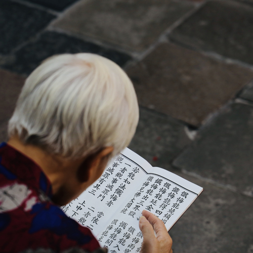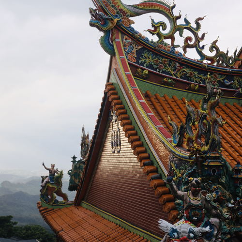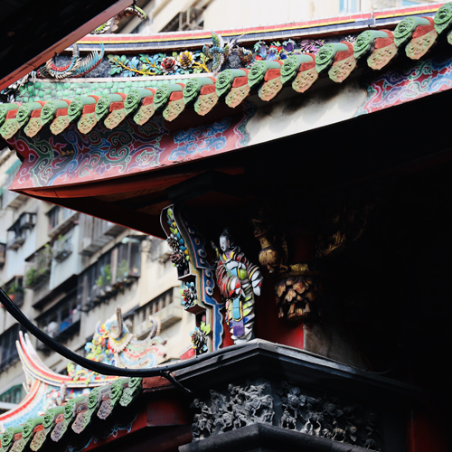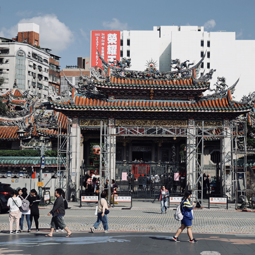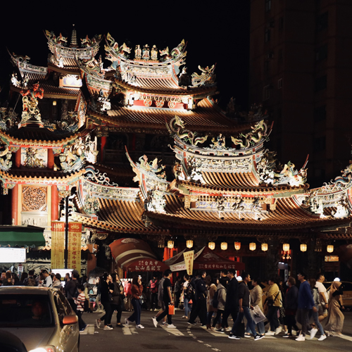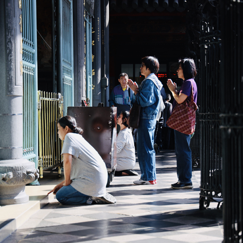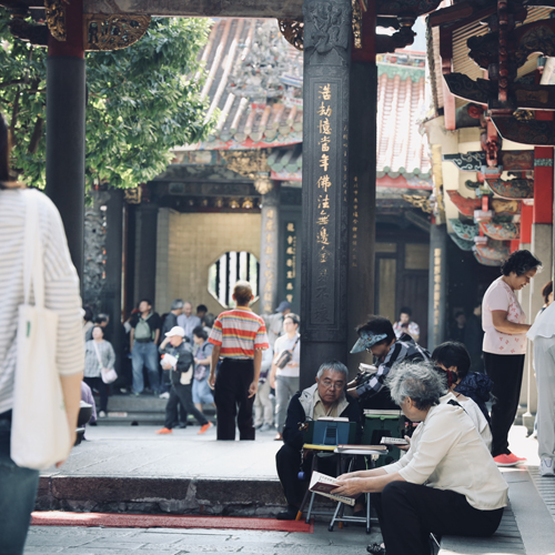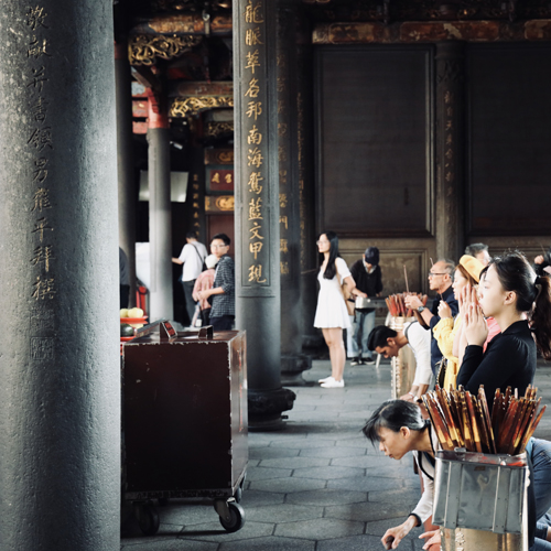 龍山寺着。信仰深くお祈りをしてます。