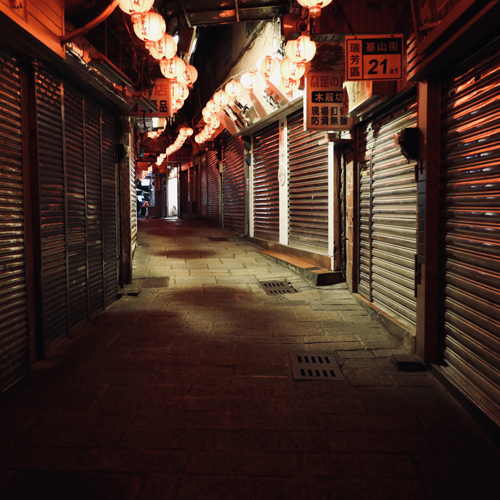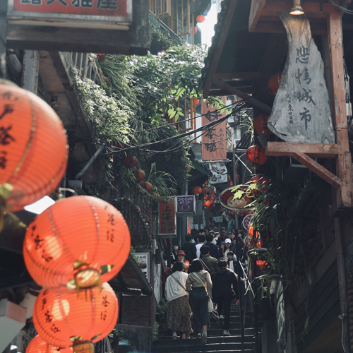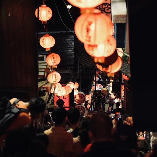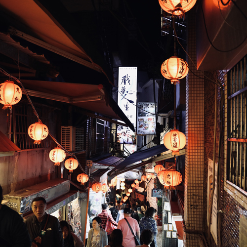 狭い路地が曲がりくねり、赤いランタンが幻想的で